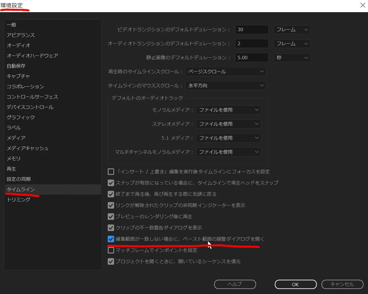 とカッコ内で書きました通り、「環境設定」の「タイムライン」の設定でペースト範囲を調整ウィンドウを表示する設定に戻せます。