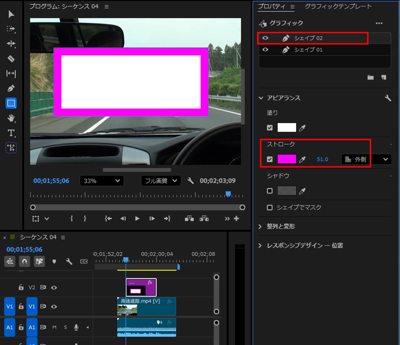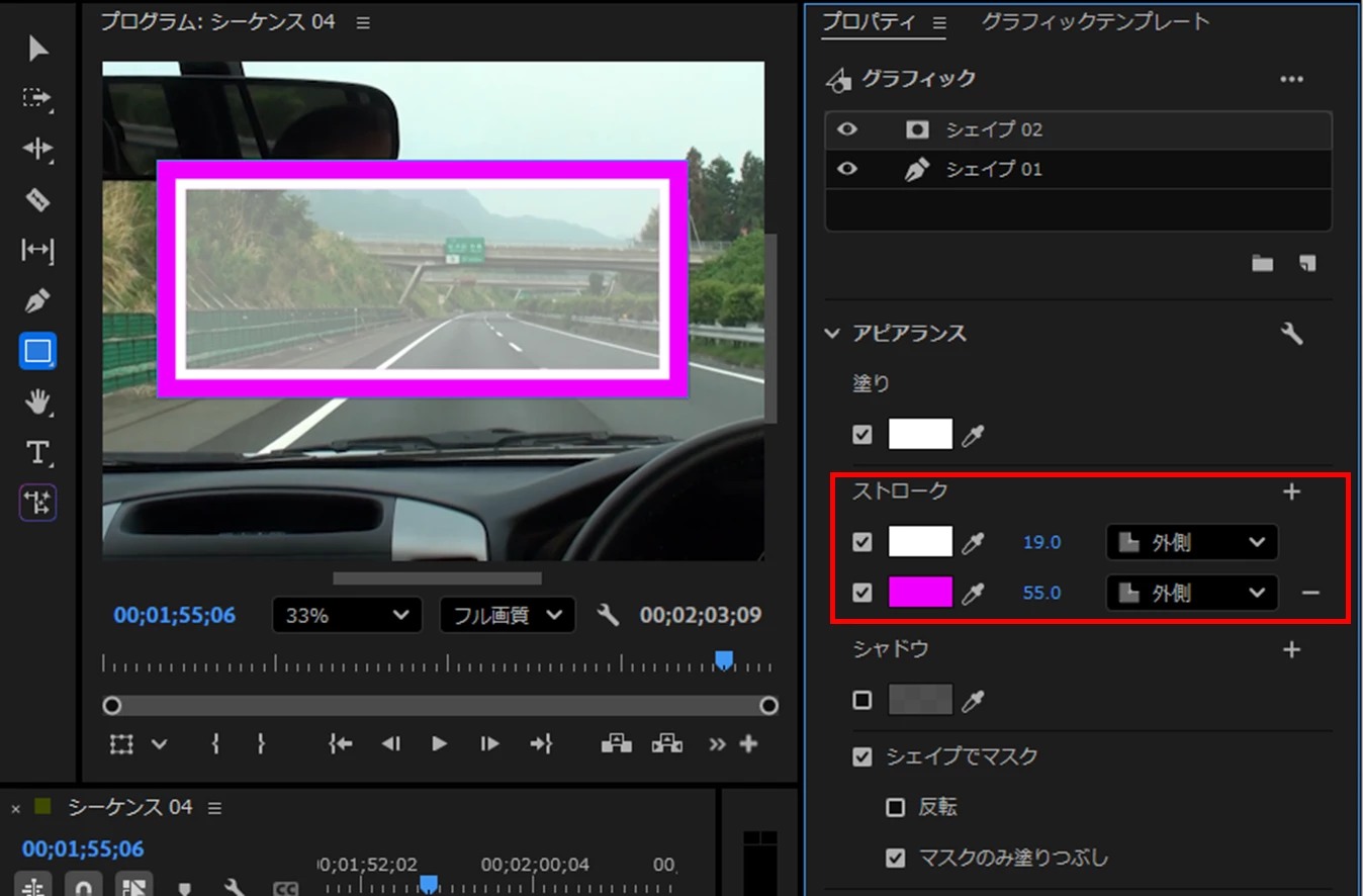 ②「シェイプ02」レイヤーを選択し、「アピアランス」項の「ストローク」にチェックを入れ「カラー」はピンクにして、「線幅」を設定し、「位置」は外側を設定します。