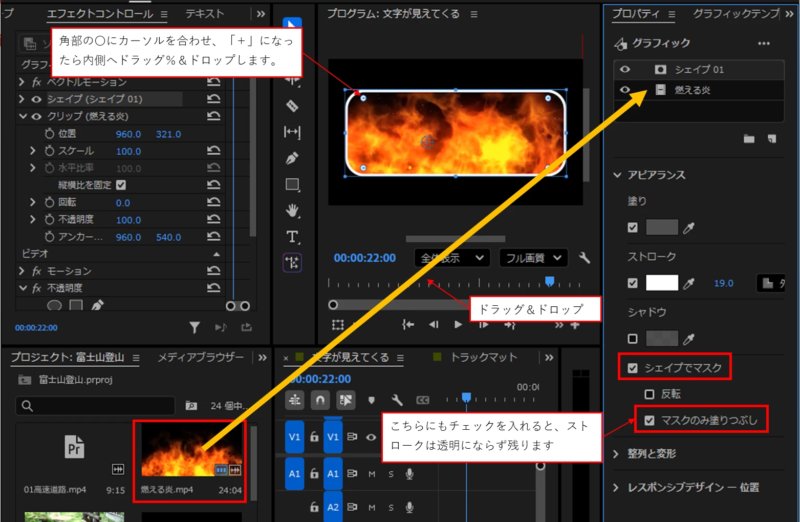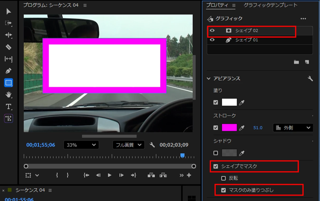 ③続いて、「アピアランス」項で「シェイプにマスク」と「マスクのみ塗りつぶし」にチェックを入れます。