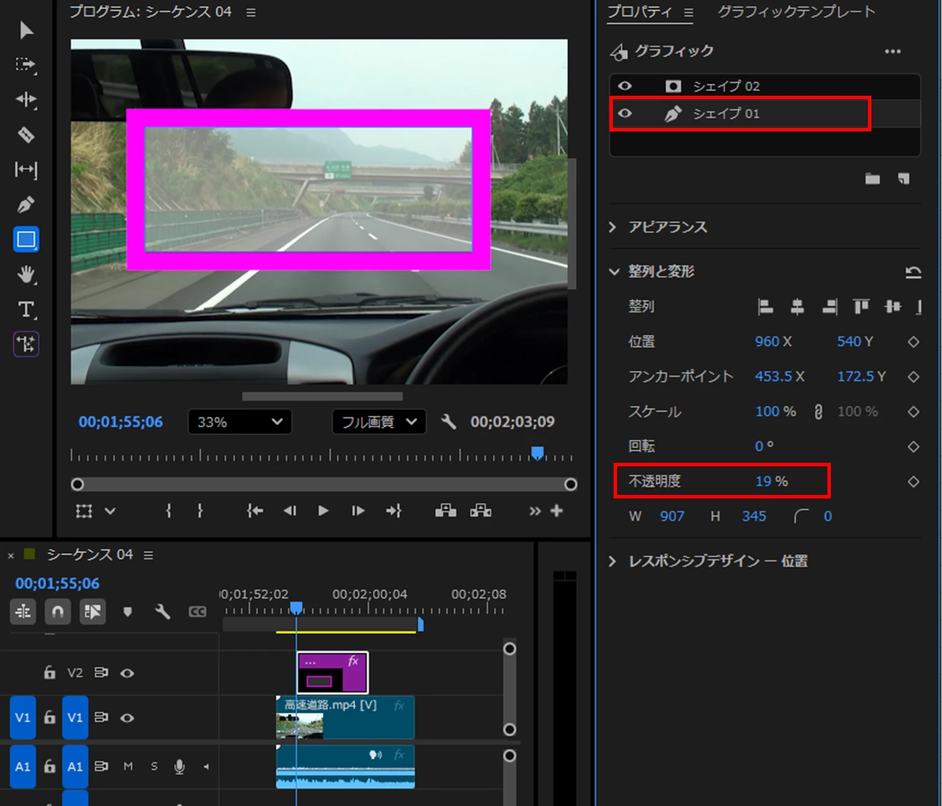 ④「シェイプ01」レイヤーを選択し、「整列と変形」項の「不透明度」の値を小さくします。すると、白が半透明になります。