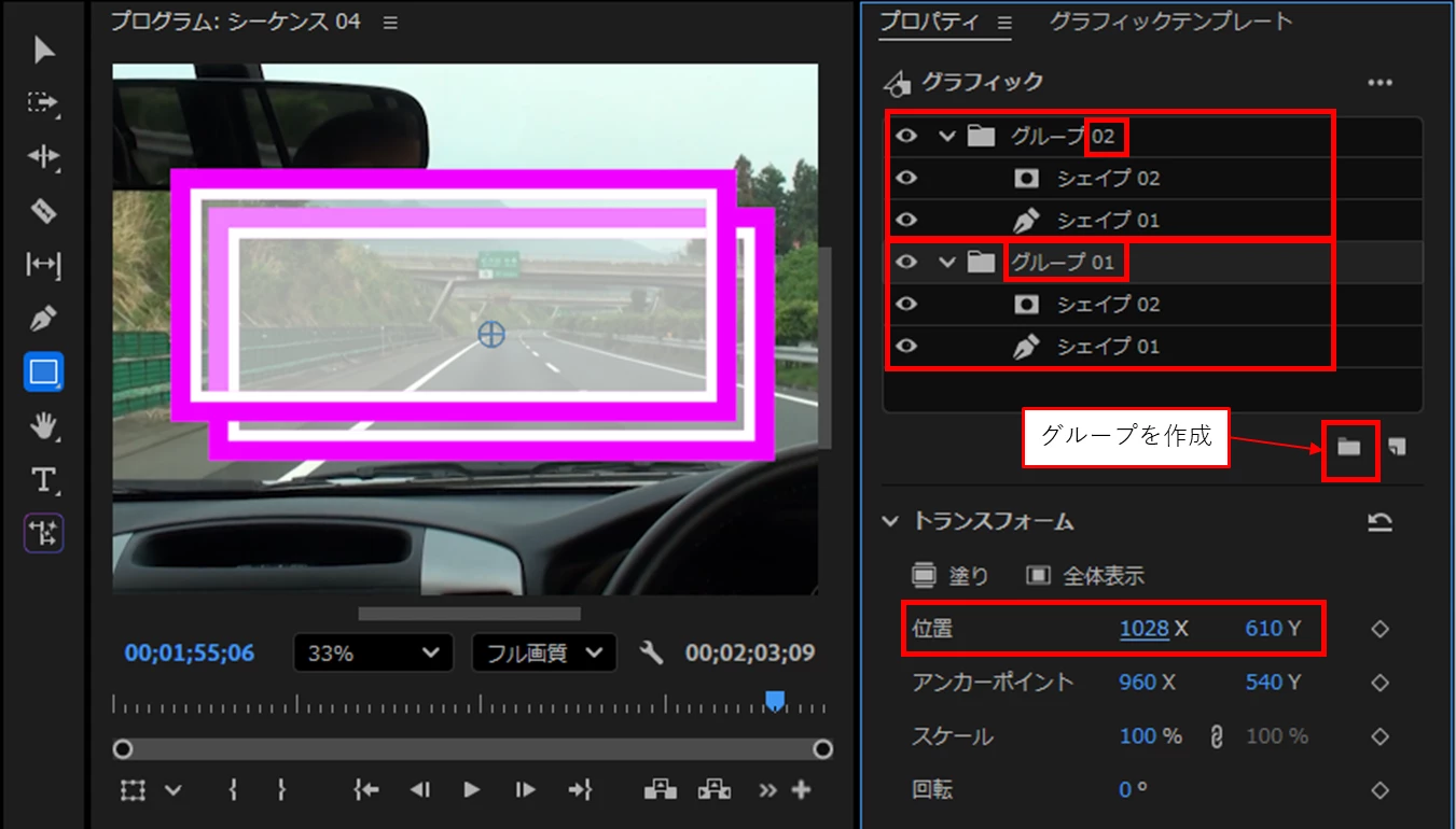 「グループ01」レイヤーを選択し、「トランスフォーム」項の「位置」の数値で位置を調整します。