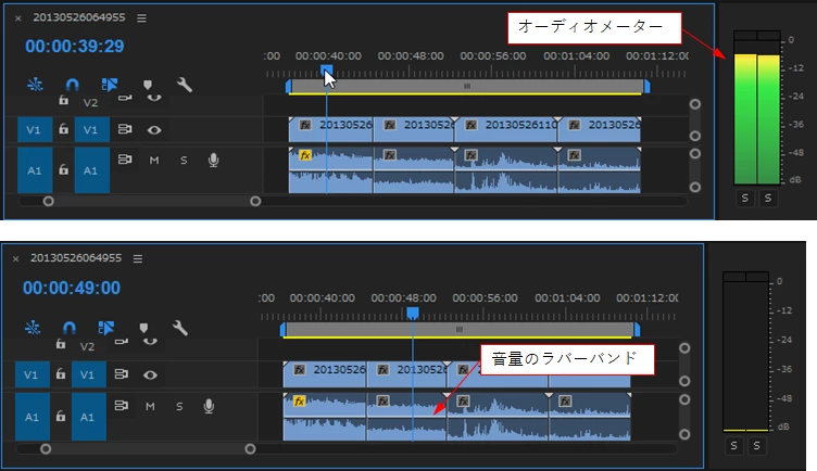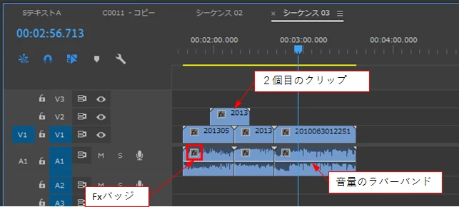 音量のラバーバンドはクリップの左上に「fx」バッジが表示されていれば、オーディオトラックの縦幅を広げれば表示されます。