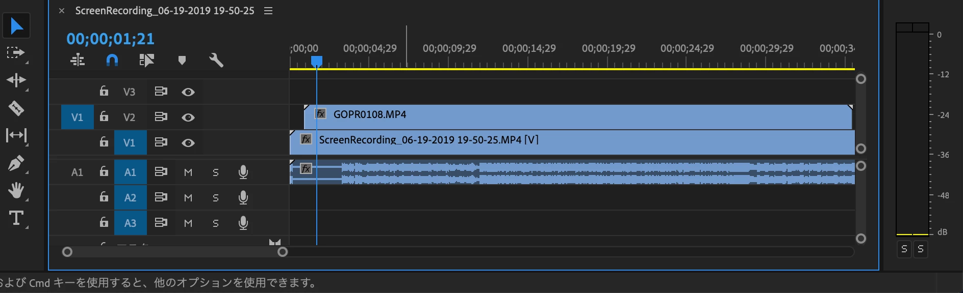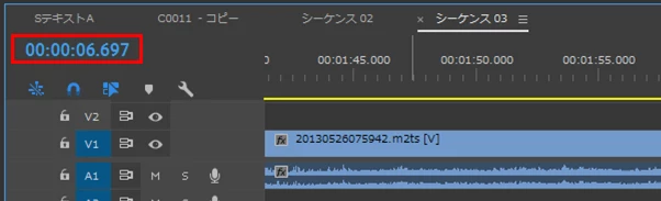 「V1、A1ソースのパッチ」ボタンはいつもクリックして青くしておきましょう。本当は大変複雑なボタンなんですが。