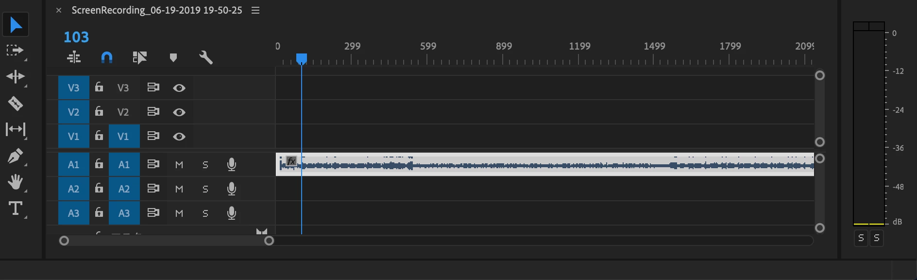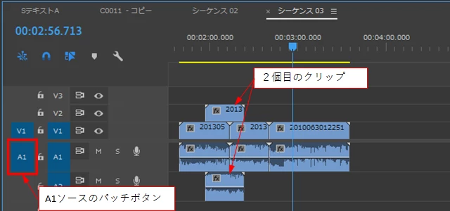 「A1ソースのパッチ」ボタンをクリックして、青くします。するとクリップを「プロジェクト」パネルからドラッグ&ドロップする時オーディオクリップも同時に配置されます。