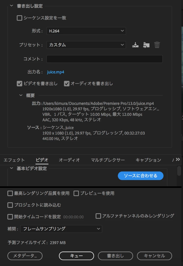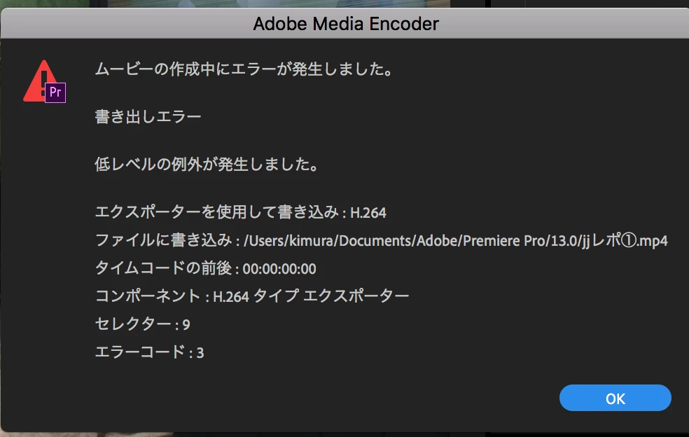 そして書き出ししようとするとすぐに以下のようなエラーが出ます。