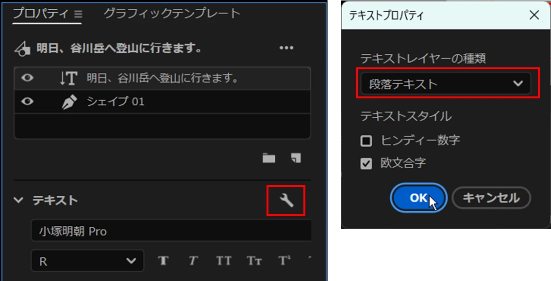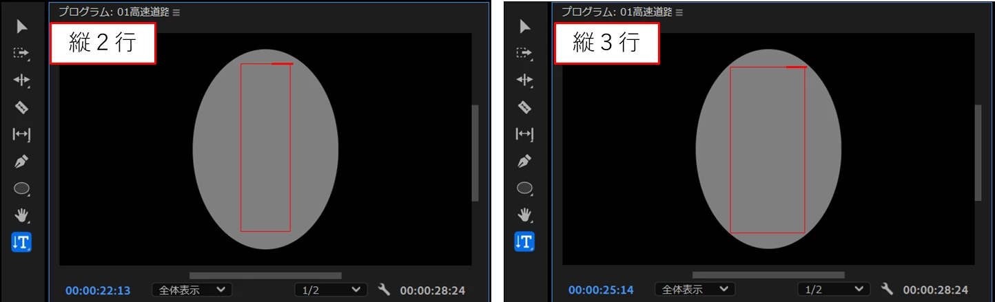①縦2行と縦3行の段落テキストのテキスト入力ボックスをそれぞれ別々のクリップに作成します。