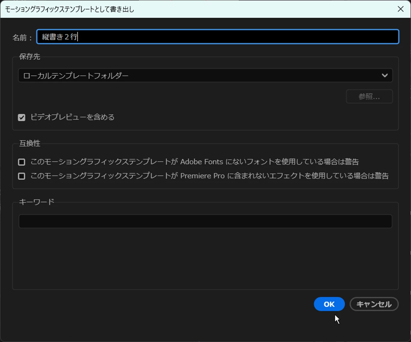 ③開いた「モーショングラフィックステンプレートとして書き出し」ウィンドウで「名前」を入力し「OK」をクリックします。