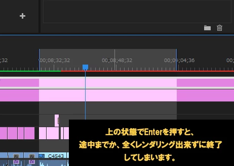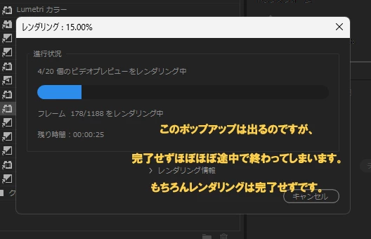 レンダリングを行いながら作業を行っているのですが、インとアウトを決めてEnterを押してレンダリングを行っても、レンダリングの進行ポップアップが出た後に途中で止まってしまいます。