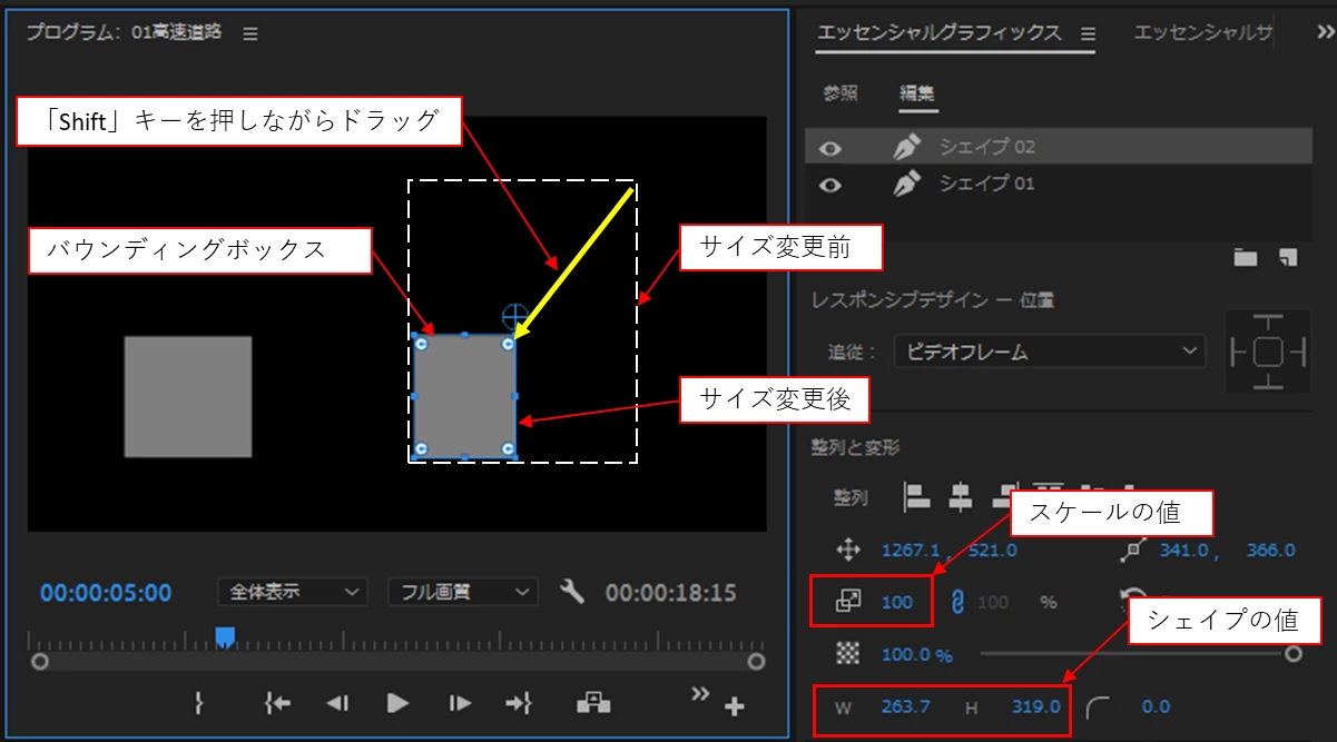 ※「シェイプの値」は変化しましが、「スケールの値」は「100」のままです。