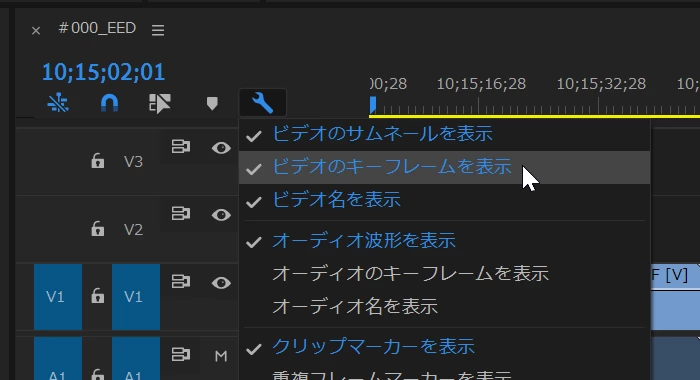 添付しました画像をご参考にしていただき、「タイムライン表示設定」(スパナのアイコン)から「ビデオのキーフレームを表示」のチェックを外していただくと消えると思います。