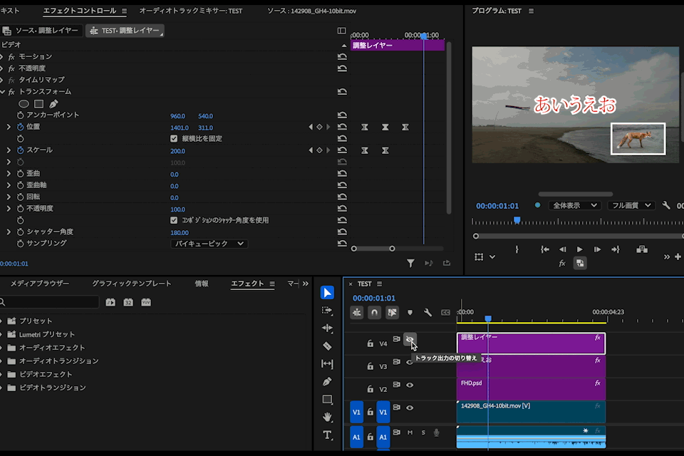 こちらを、アフターエフェクトのカメラ機能のようなズームや、画面全体をカメラで舐めるような演出をプレミアプロで再現可能でしょうか。