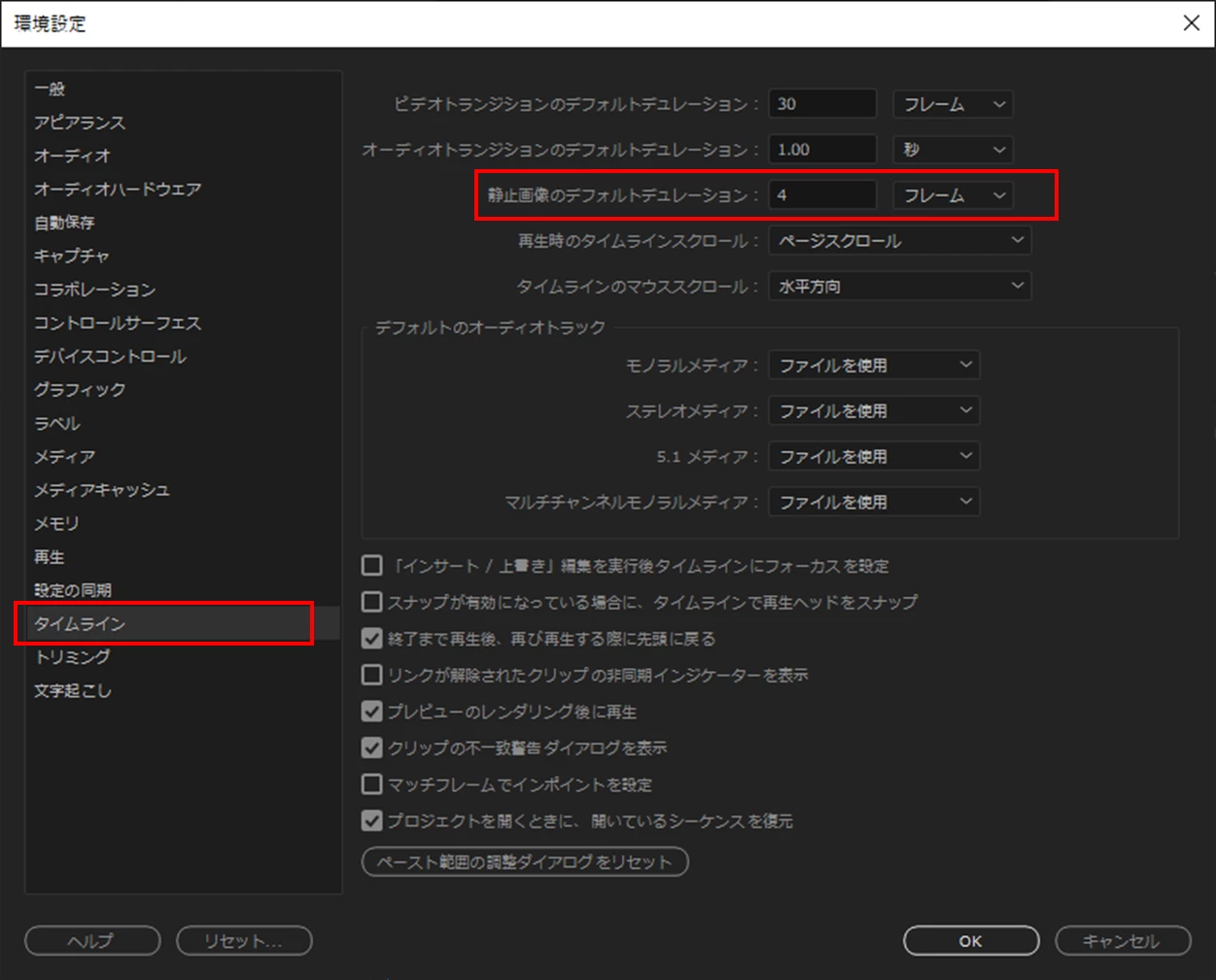 メニューの「編集」→「環境設定」→「タイムライン」を選択し、開いた「環境設定」ウィンドウで、「静止画像のデフォルトデュレーション」を「4 フレーム」に設定し、「OK」をクリックします(下図赤枠部)。