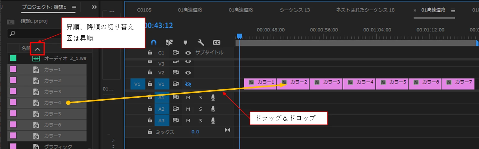 「プロジェクト」パネルで素材アセットの並び順(昇順、降順)によって、ビデオトラックでの並び順も変わります。後でご確認いただけたらと思います。ご存知でしたらごめんなさい。