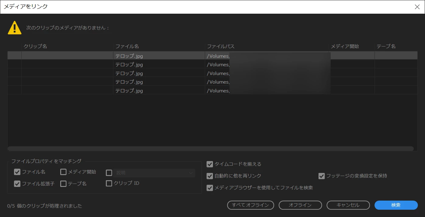 製作途中のファイルを開いたところ、「メディアをリンク」ウィンドウが表示され、「次のクリップのメディアがありません」となります。