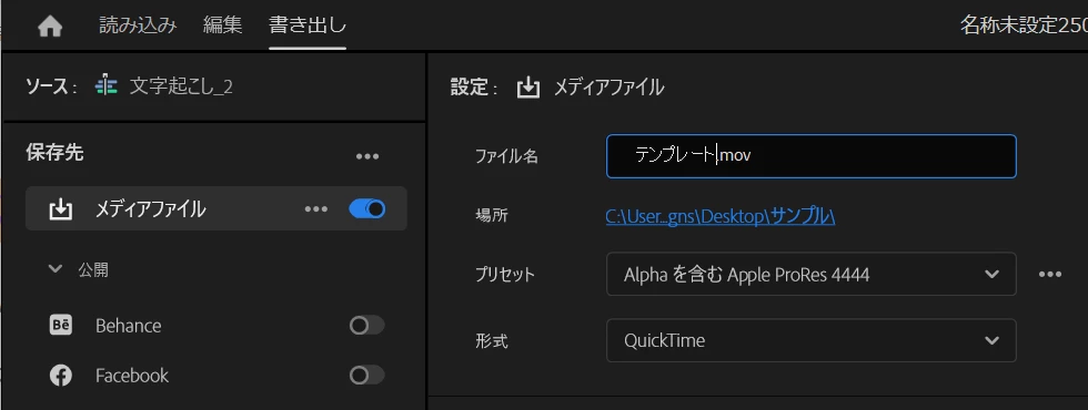 ◆テキストアニメーションの場合は(効果音なし)、「モーショングラフィックステンプレート」として書き出す方法があります。