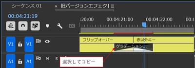 ②読み込んだプロジェクトのビデオトラックのトランジションを選択し、メニューの「編集」→「コピー」(ショートカットキー;Ctrl+C)を選択します。