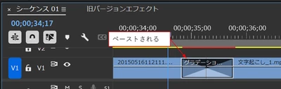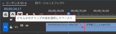 ③Premiere Pro v24.6以降のプロジェクトに切り替え、トランジションを適用する片方のクリップの端を選択して赤くし、メニューの「編集」→「ペースト」(ショートカットキー;Ctrl+V)を選択します。