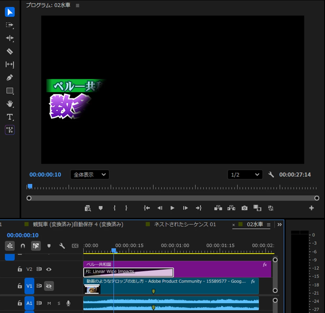 ②テキストに、「Fi:Linear Wipe Impacts」トランジションを適用しテキストを斜めにぼかしながらワイプします。適用時間は約1秒です。