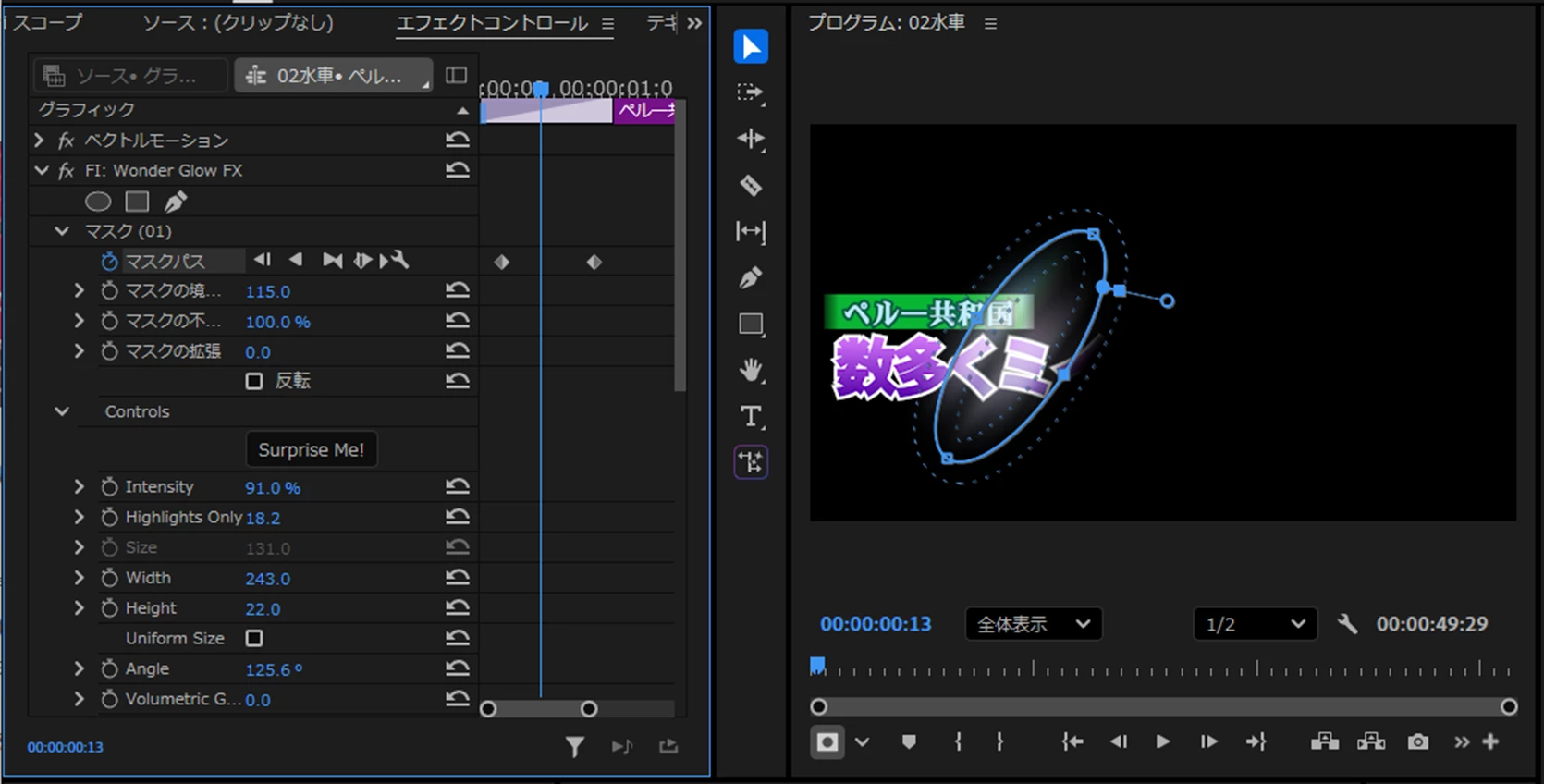 ④FI:Wonder Glow FX」エフェクトにマスクを適用し、図のように形状変更しぼかしを適用します。