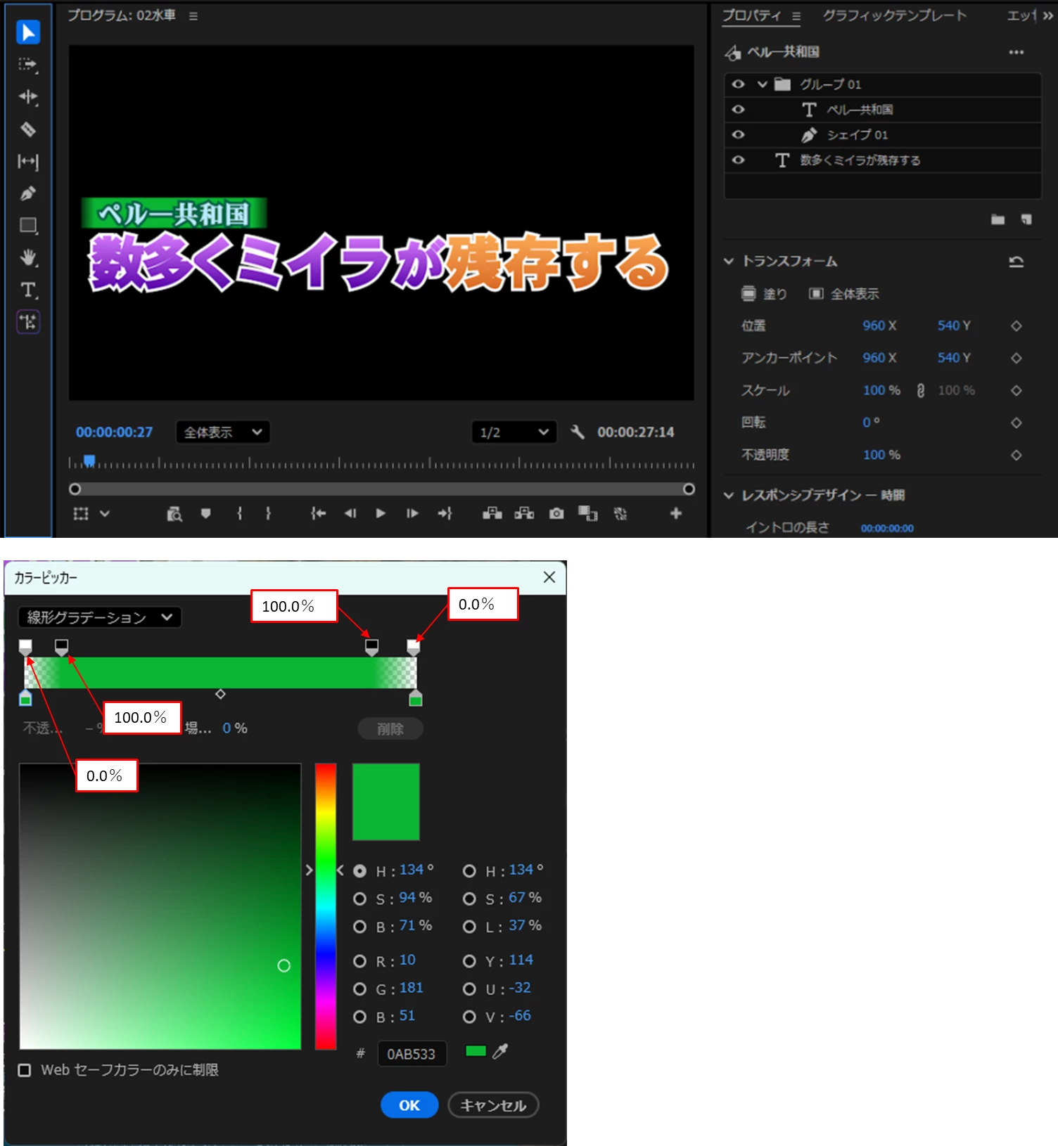 ・「数多くの・・・・残存する」のグラデーションはPremiere Pro以外のソフトで作成したのではと思います。ここではPremiere Proで作成できるグラデーションを適用しました。