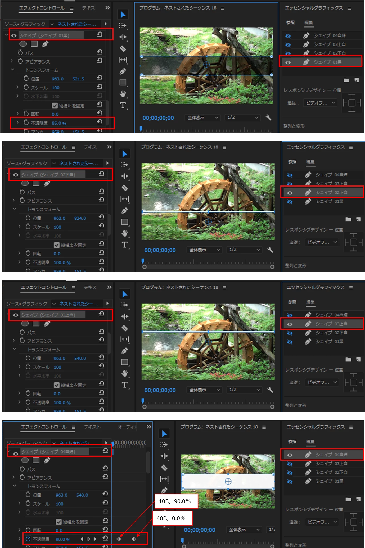 ・キラーンの光る長方形は黒の長方形をコピーして作成します。不透明度にキーフレームを打ちます。