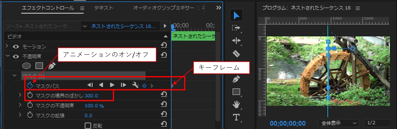 ⑤「マスクの境界のぼかし」の値を約300にします。開始時間に再生ヘッドを移動し、「アニメーションのオン/オフ」アイコンをクリックします。すると、再生ヘッド位置にキーフレームが打たれます。