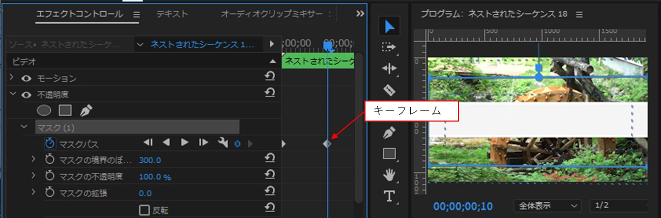 ⑥再生ヘッドを10Fに移動し、マスクのマスクハンドル位置を図のように移動して配置します。すると、再生ヘッド位置にキフレームが自動的に作成されます。