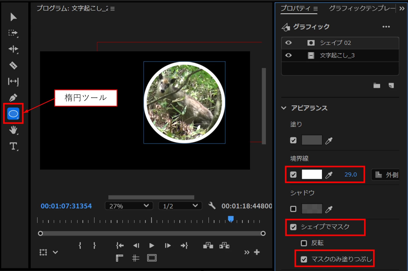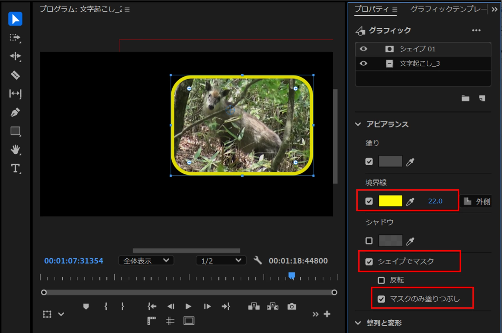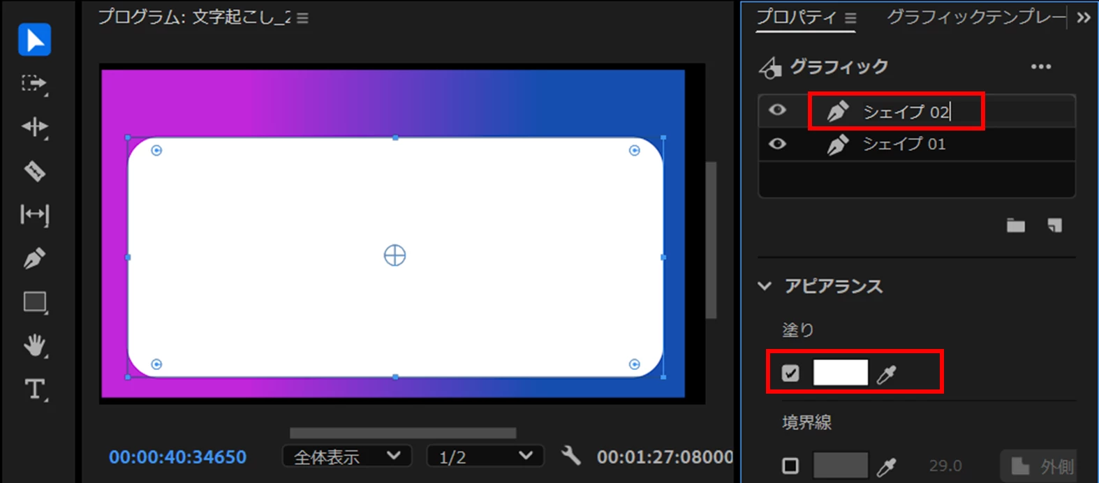 不透明度のマスクやクロップエフェクトでマスクして「塗りつぶし」エフェクトをかける方法もありますが、この方法では角丸が付きません。音声はそのままつきますが。