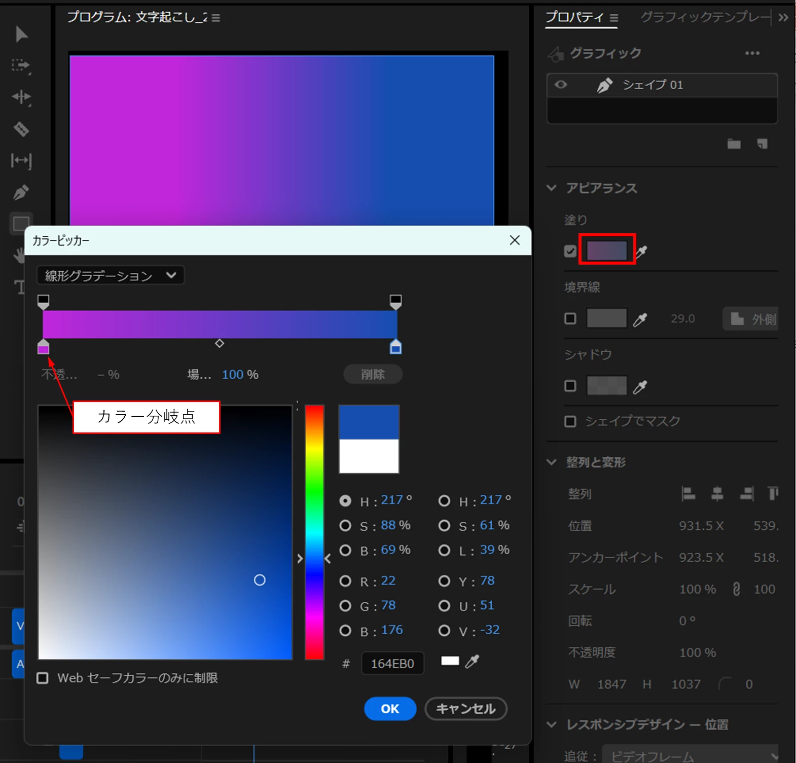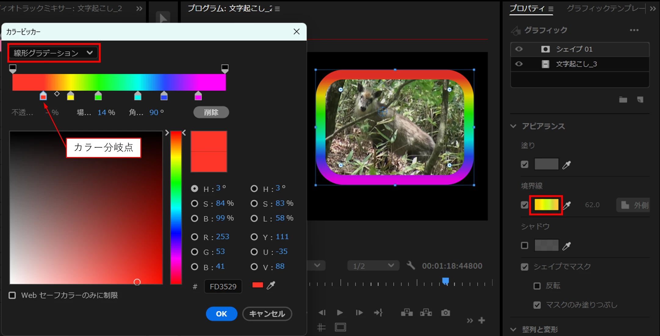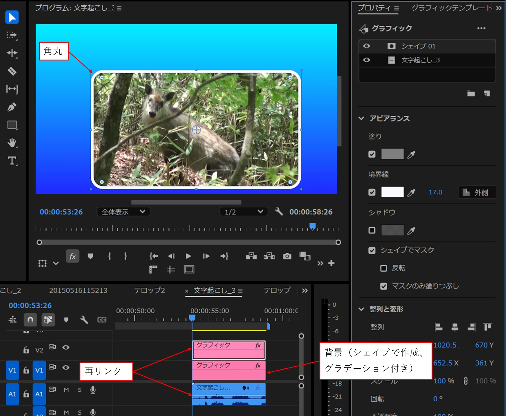 下図はマスクのシェイプに角丸を付け、音声クリップを再リンクしました。背景はシェイプで作成、グラデーション付きです。
