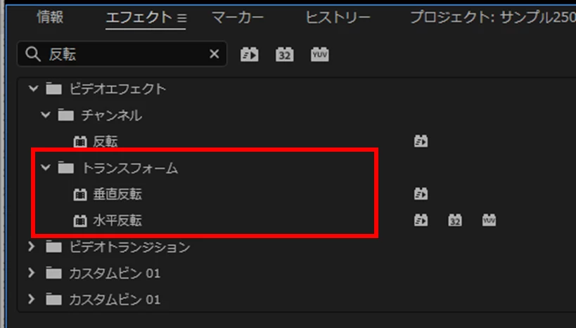 「トランスフォーム」は「垂直反転」などと同じく、エフェクトパネルにあります。
