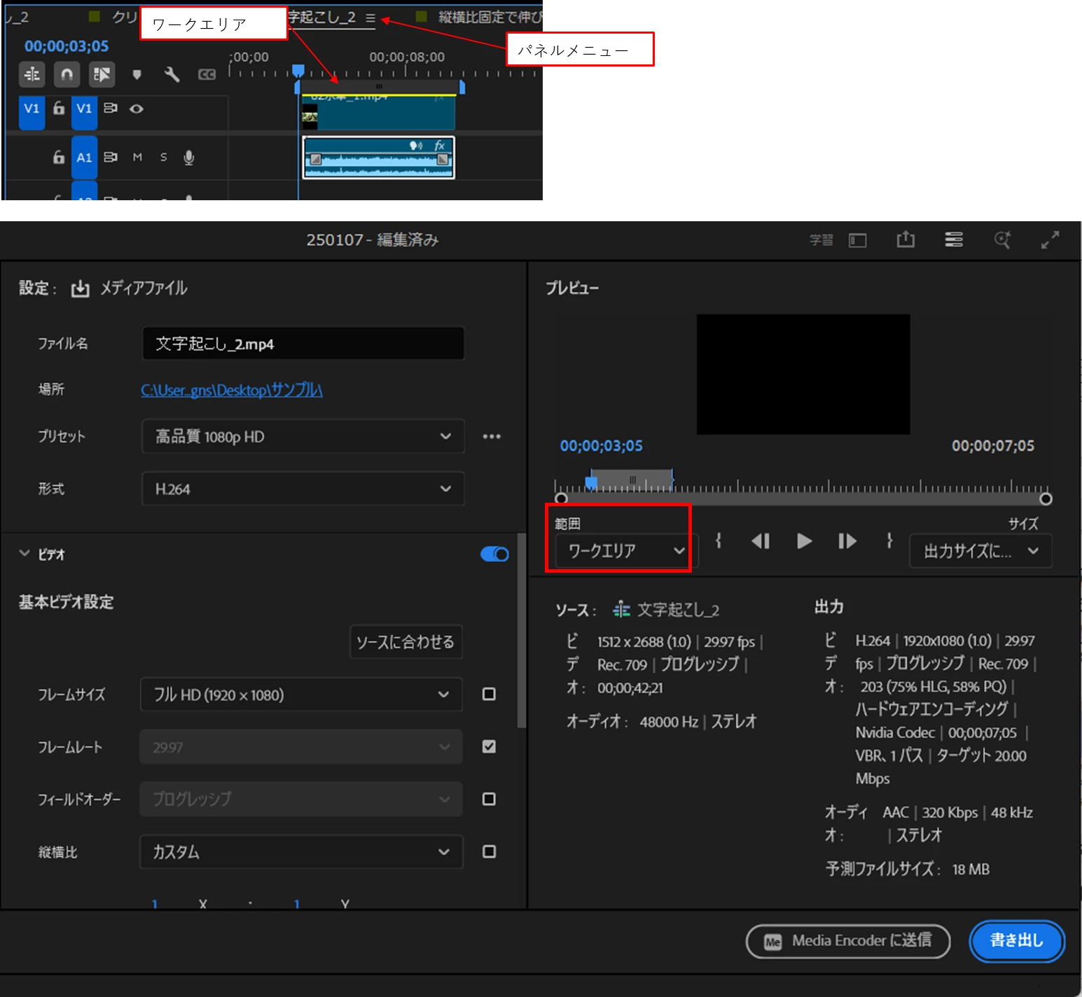*別方法としてワークエリアではなく、イン点・アウト点に設定し、書き出し設定で範囲を「ソースイン/アウト」に設定して書き出します。