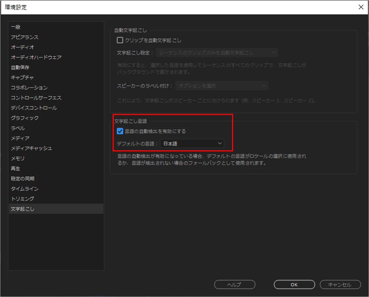 「環境設定」の「文字起こし」で、「文字起こし言語」項で、「言語の自動検出を有効にする」にチェックを入れるか、または「デフォルトの言語」を「日本語」にします。最後に「OK」をクリックします。