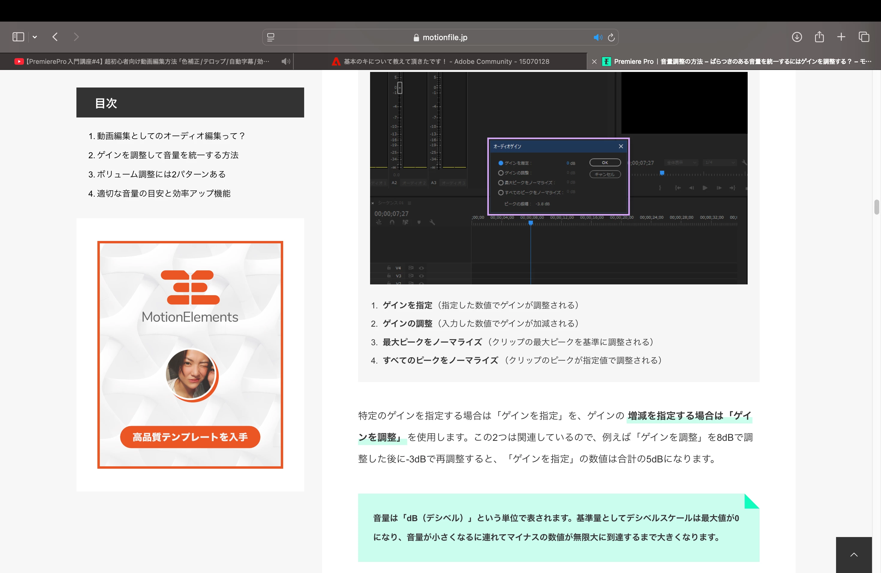 3番目と4番目の使い分けですが、例えば一連のインタビューをカット編集したような場合には3つ目の方法が適しています。4つ目の方法を使うと、カットごとにバラバラのゲインとなり、かえってカットごとの音量に差が出てしまうことがあります。