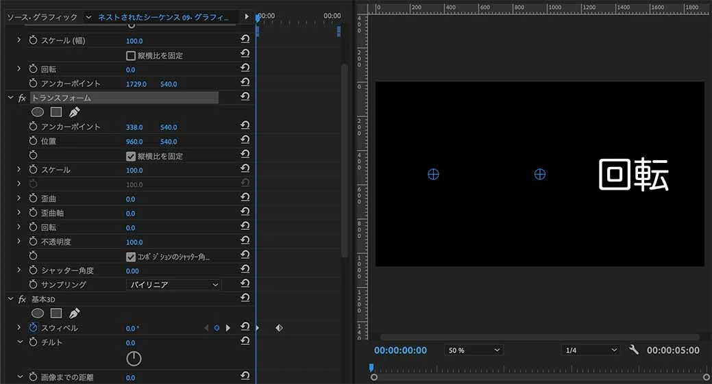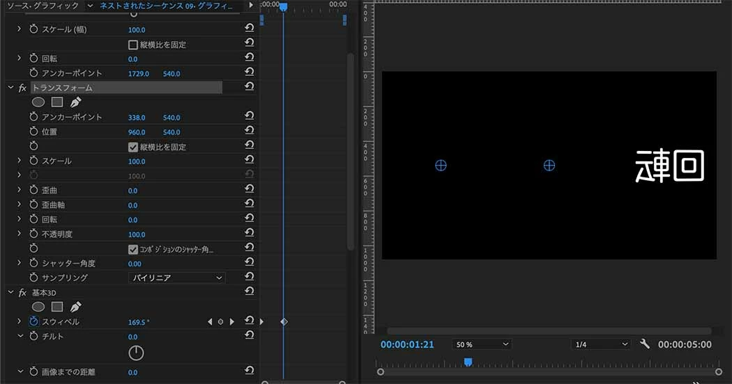 3D回転させるテロップや画像を別のシーケンスで作成し、「基本3D」エフェクトをかけます。