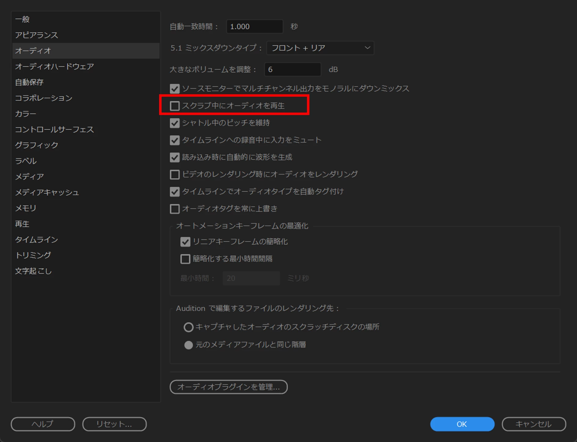 「環境設定」→「オーディオ」で、「スクラブ中にオーディオを再生」のチェックが外れていませんか。