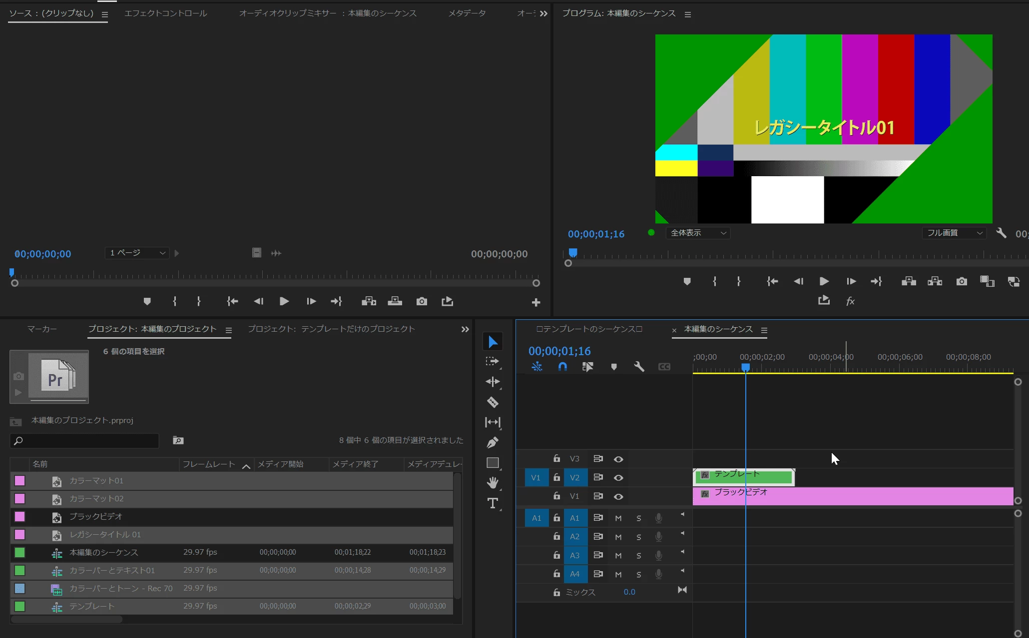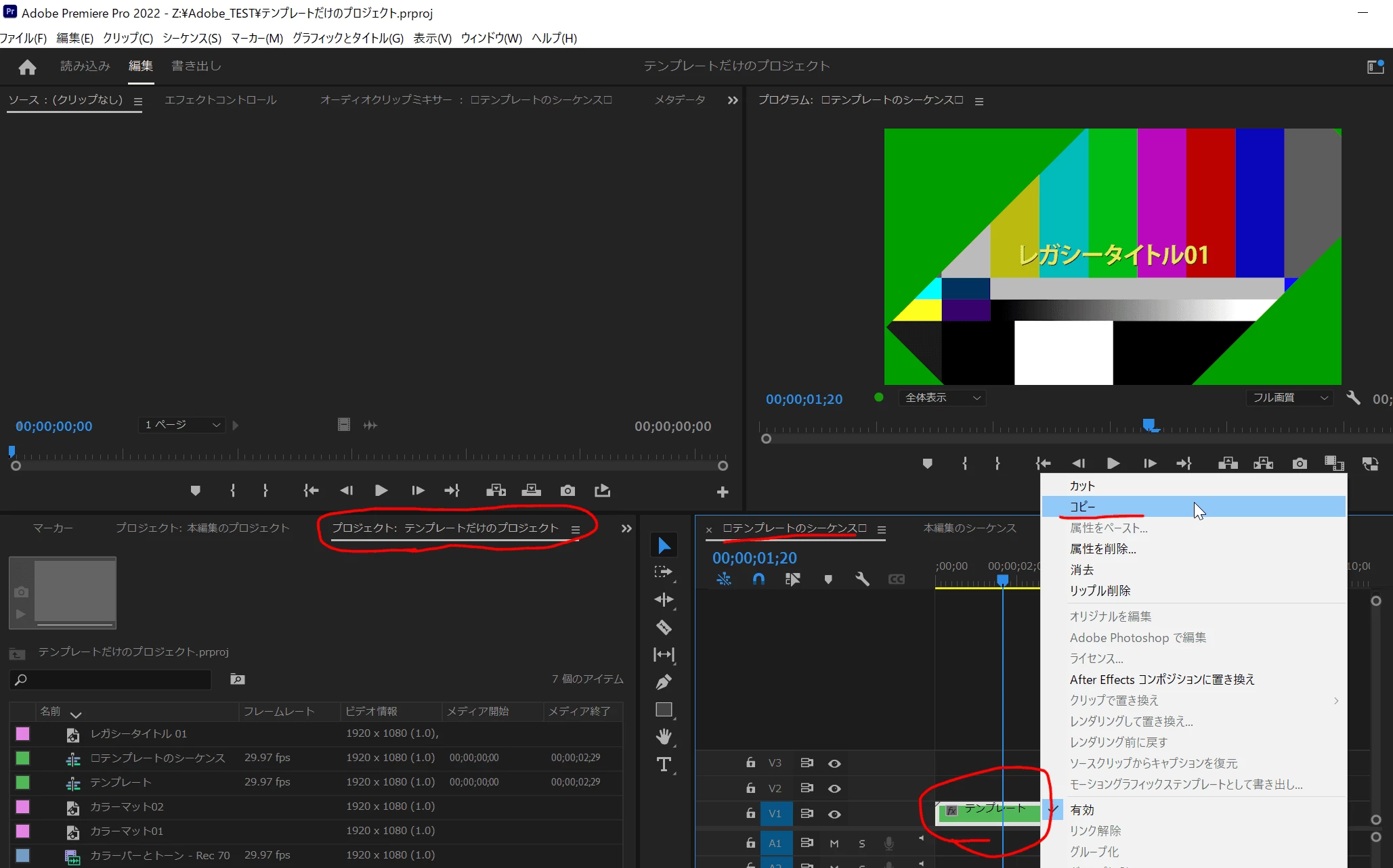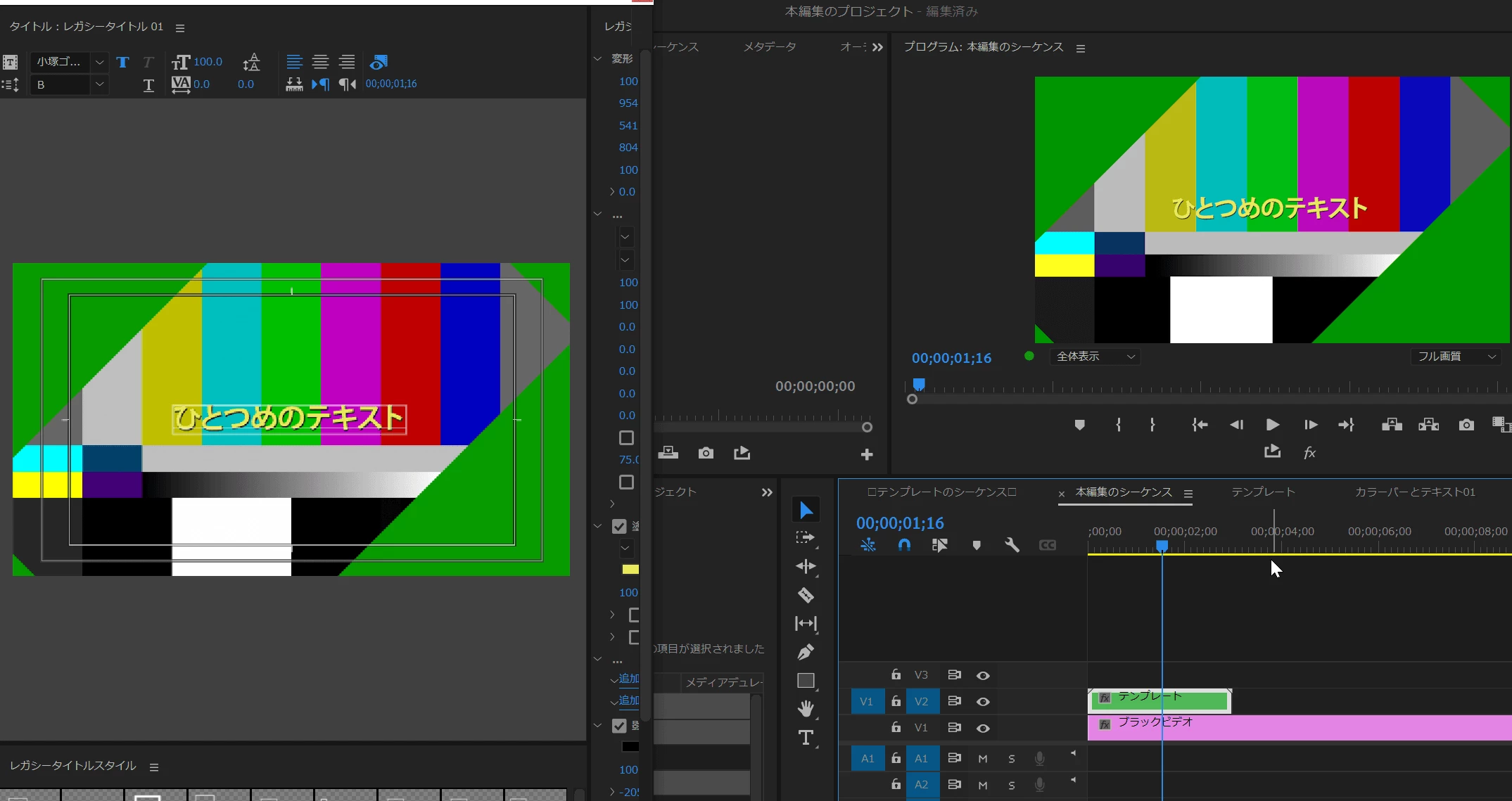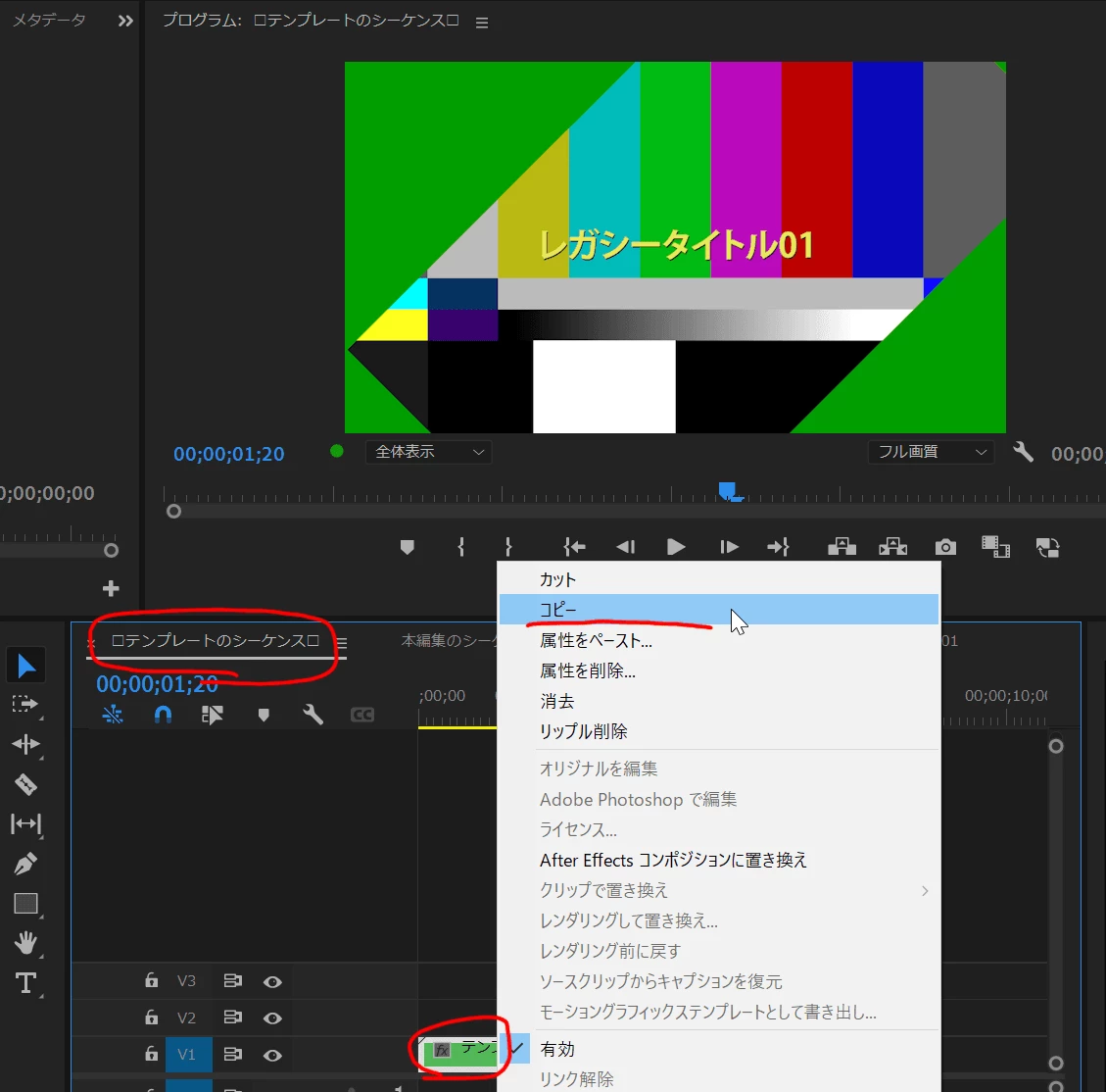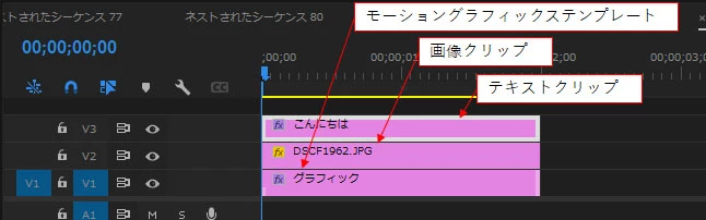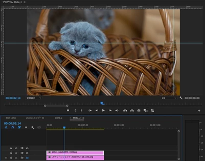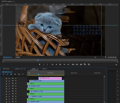 調べた情報を参考に、プロジェクトにて「pScene_2 コピー 01」の大元のネストを複製し、タイムライン上にドラッグ&ドロップで表示し、その中身を編集したら、大元のネストの画像やテキストも書き換わってしまいました。