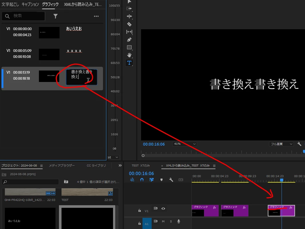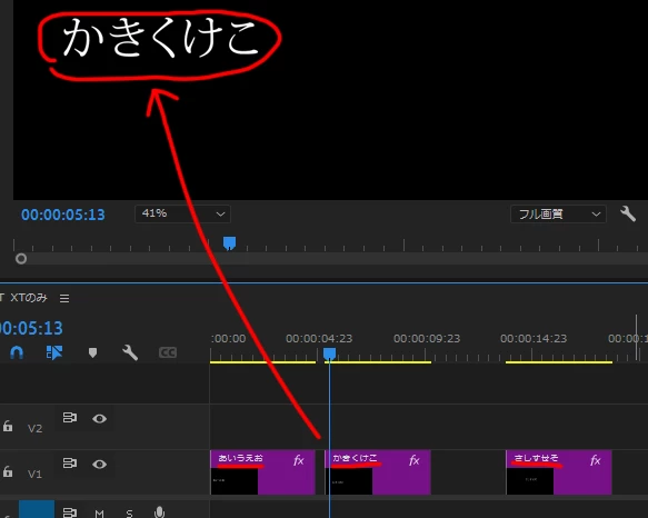 ⑤すると、キャプションセグメントクリップがビデオトラックでエッセンシャルグラフィックステキストクリップに変換されます。