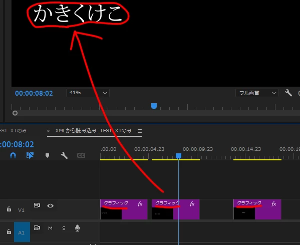 Vrewで文字起こし後xmlファイルで出力し、Premiere Proにそのxmlファイルを取り込むと、ビデオトラックにグラフィッククリップが作成されますよね。