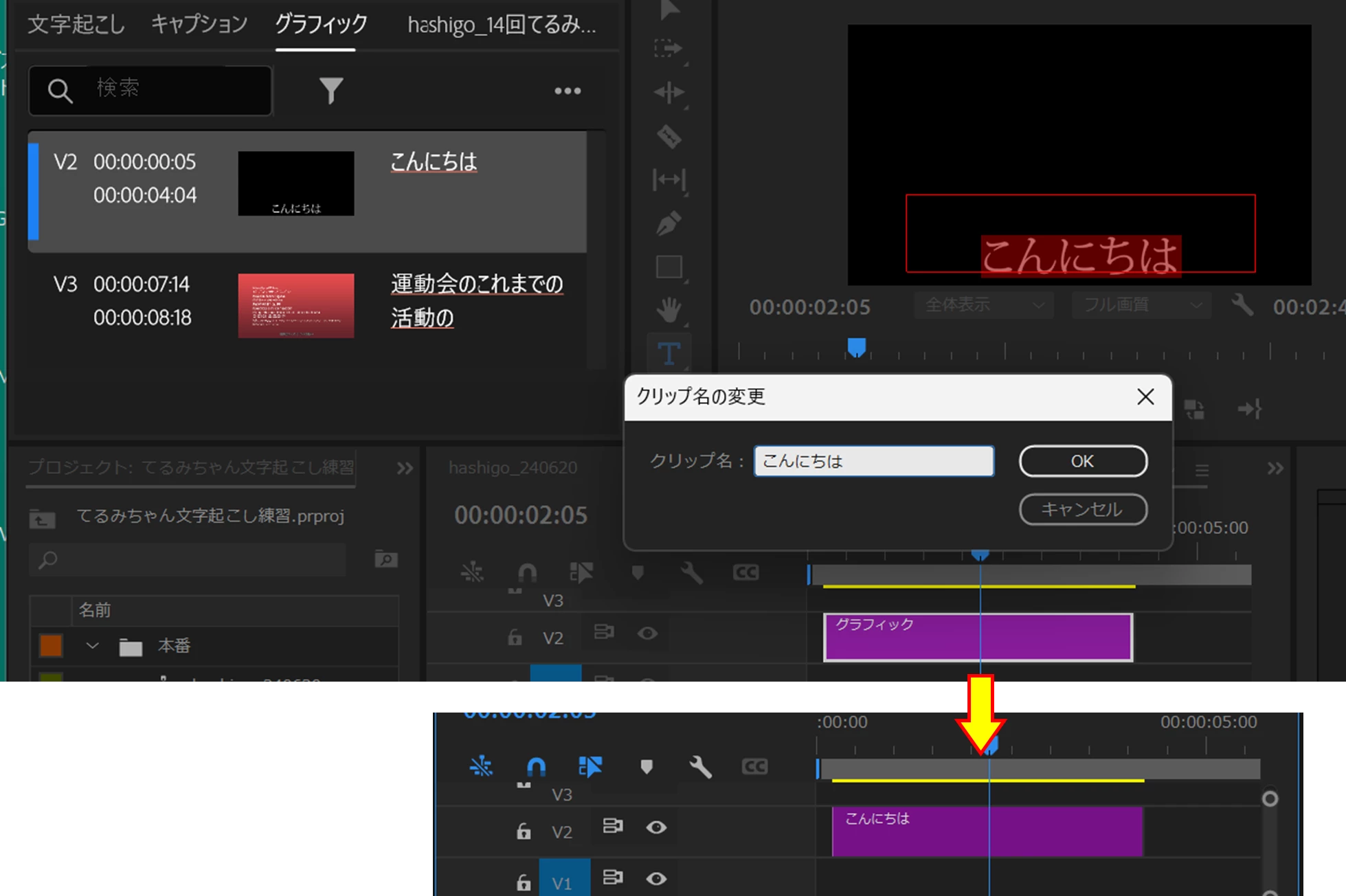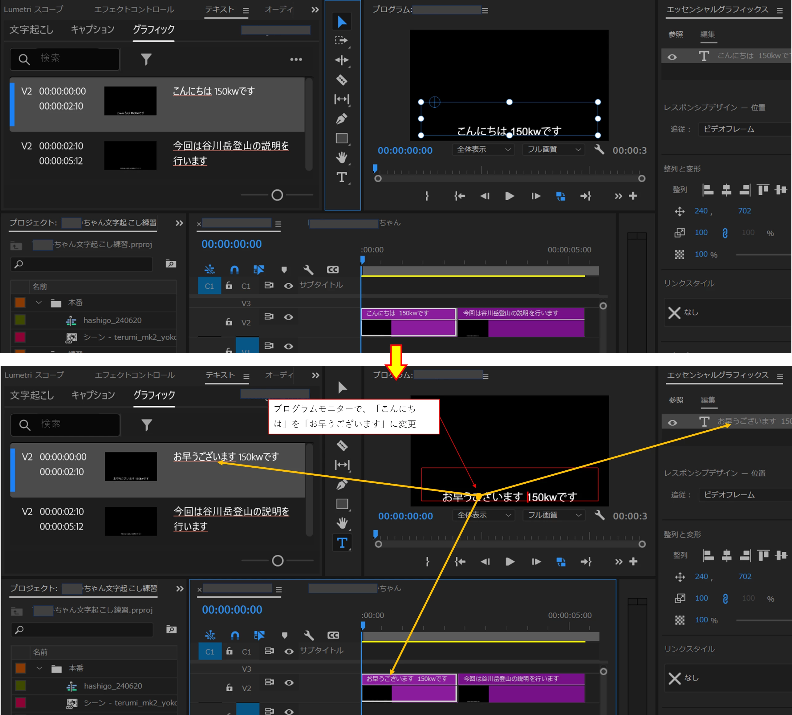 この状態から、「テキスト」パネルの「グラフィック」タブ、または「プログラムモニター」で字幕を変更すればエッセンシャルグラフィックステキストクリップの名前も変更されます。