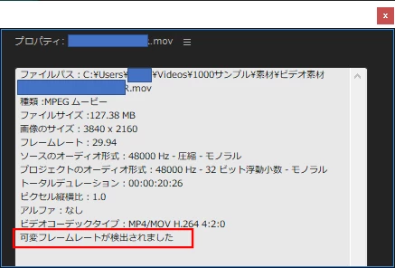 確認方法は、そのクリップを右クリックし、開いたコンテキストメニューから「プロパティ」を選択して開いた「プロパティ」ウィンドウで、「可変フレームレートが検出されました」(下図赤枠部)と記載があります。