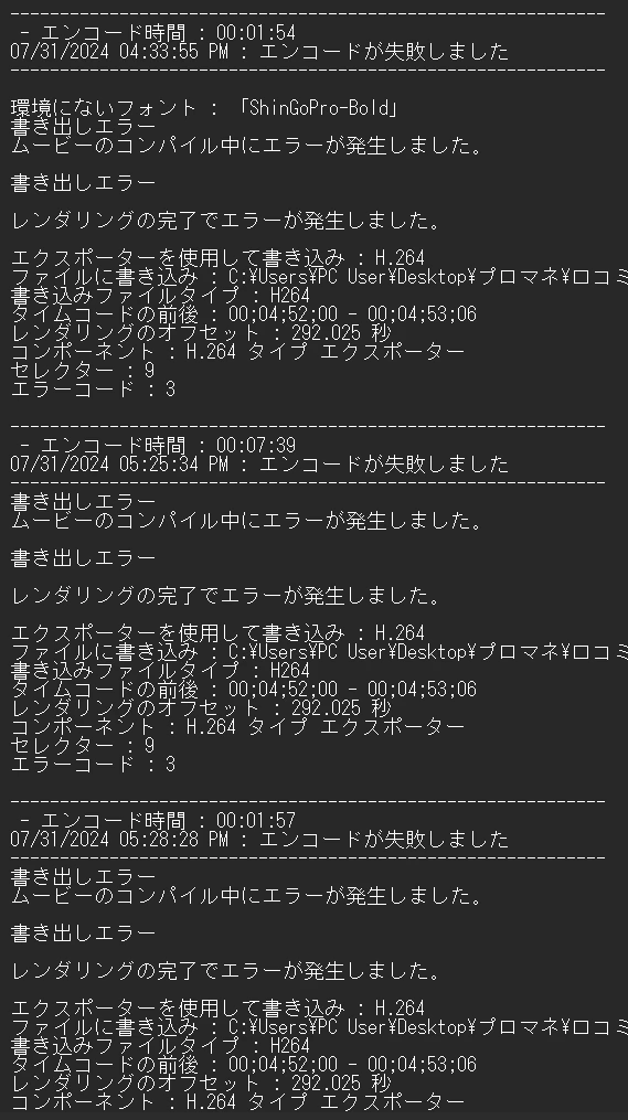 一度、環境にないフォントでエラーが発生しましたが、特にテロップでは環境にないフォントでないものに変換しているため、問題ないはずなのと、720Pの時は問題なく書き出しできたのでフォントの問題ではないのかなと思っています。