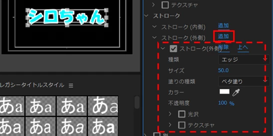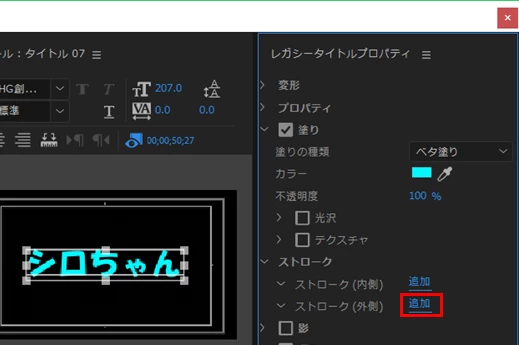 ②「レガシータイトルプロパティ」パネルで、「ストローク(外側)」項の「追加」(下図赤枠部)をクリックします。