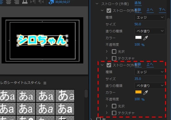 ④すると、また「ストローク(外側)」項が展開され、2番目のストローク(輪郭)の設定が出来ます(下図赤破線枠部)。設定方法は、上記③と同様です。