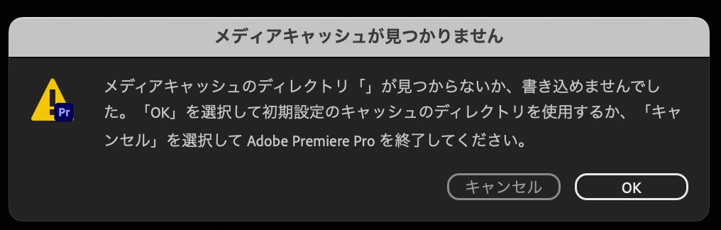 ちなみにPremiere Pro 2022起動時に「キャッシュのディレクトリ」が見つからないと出ますが、関係性はありますでしょうか?ちなみに何度も「OK」を選択しても起動時には毎回表示されます。