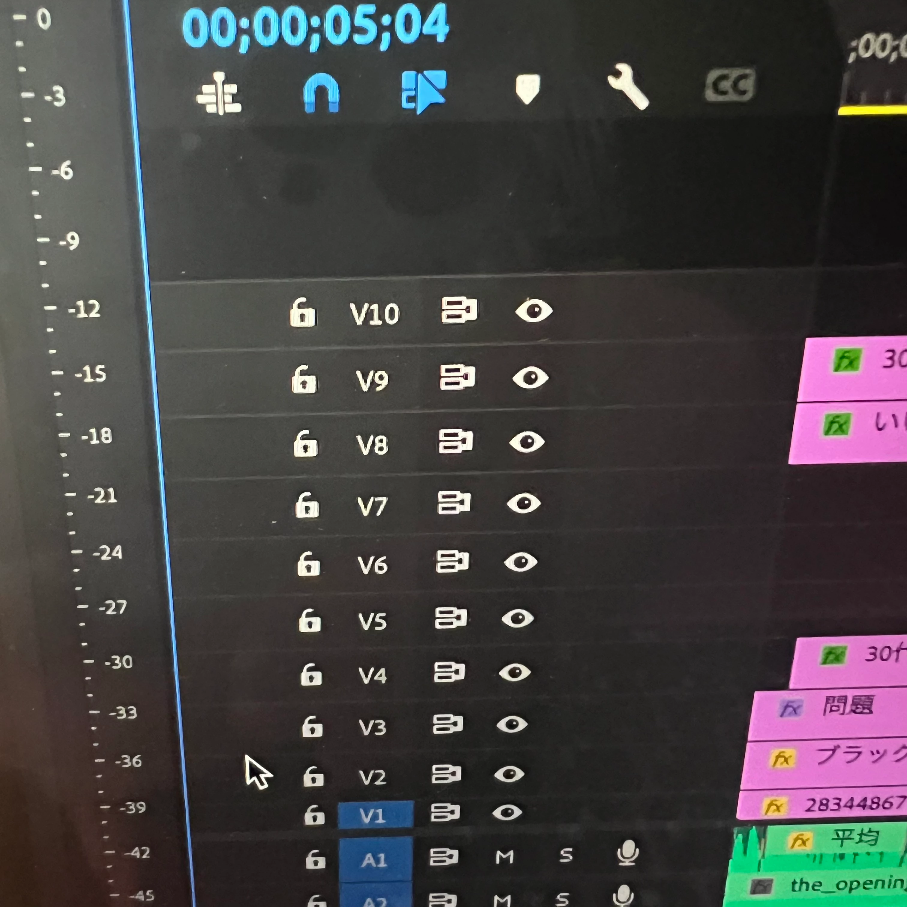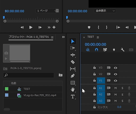 タイムラインパネルの一番左の「挿入や上書きを行うソースパッチパネル」が反応せず、選択できません。