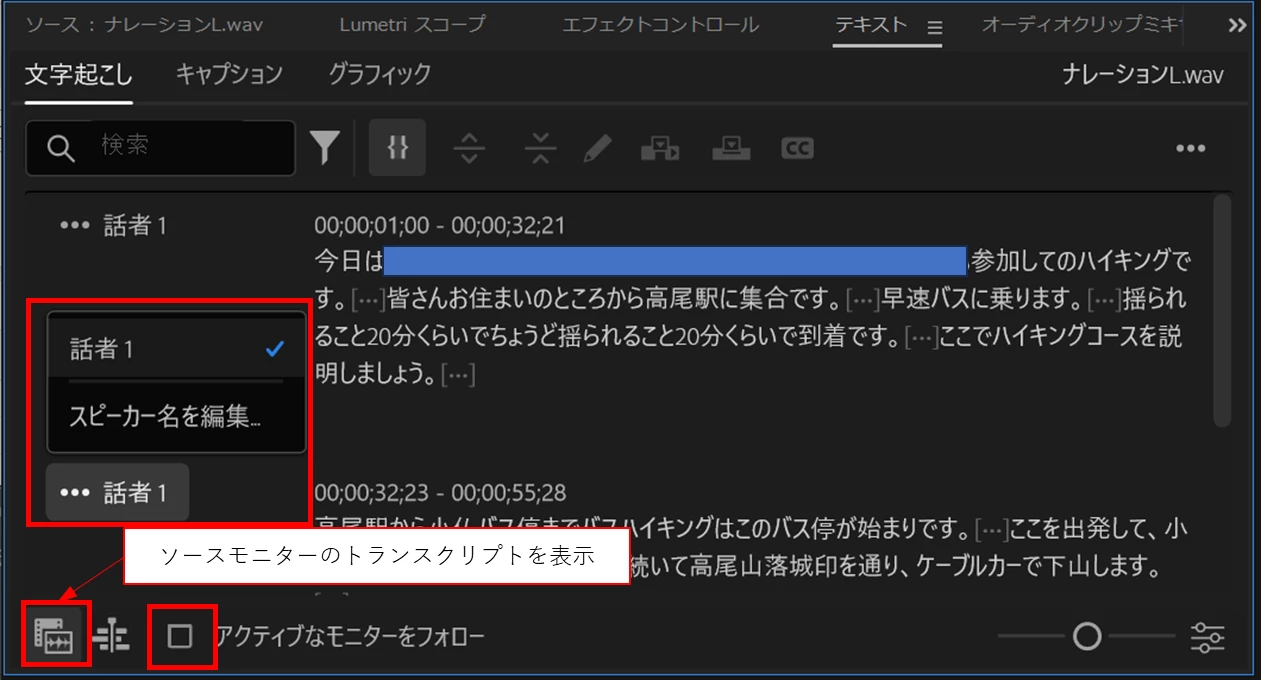 ②「ソースモニターのトランスクリプトを表示」をクリックします。