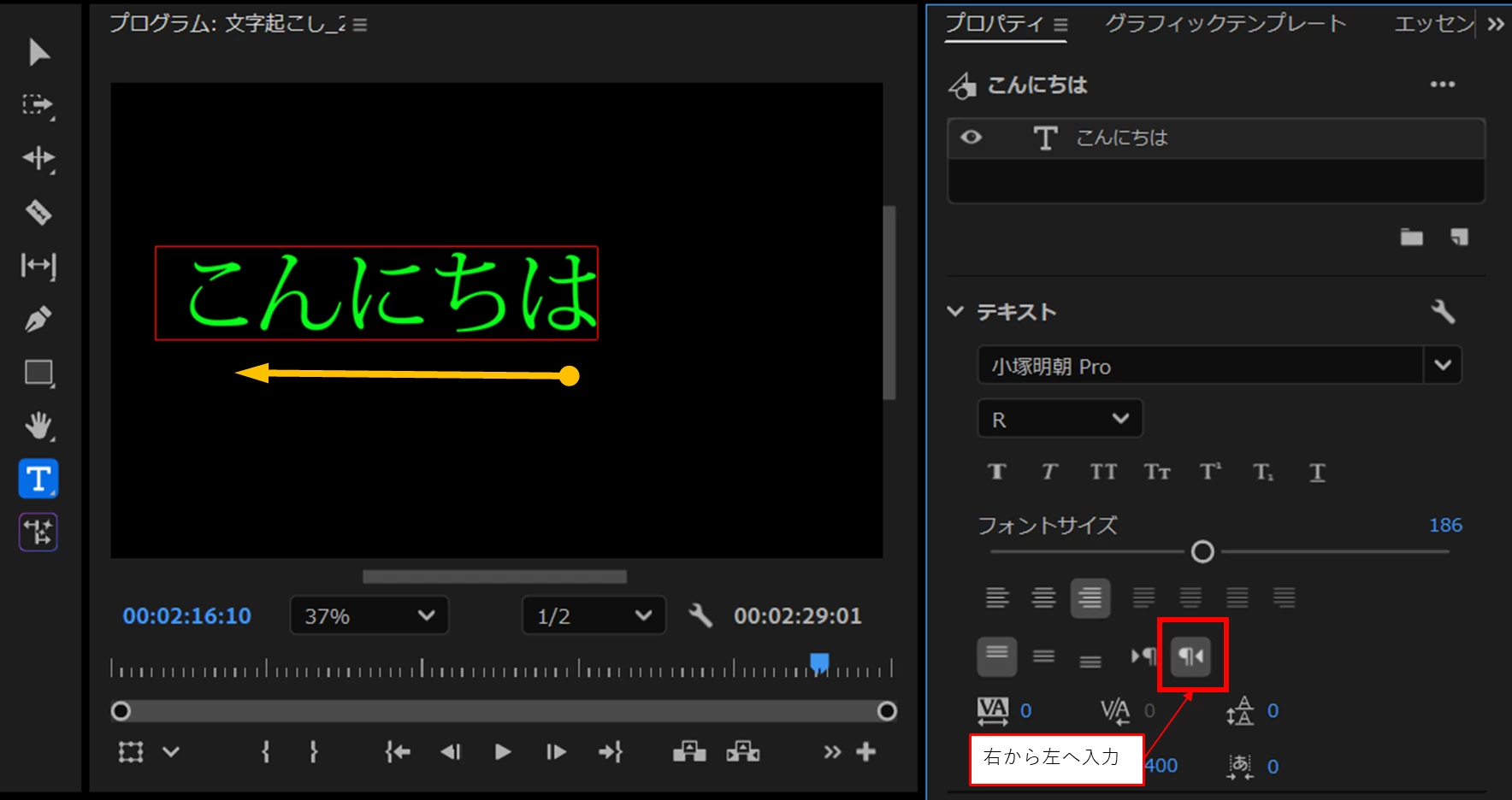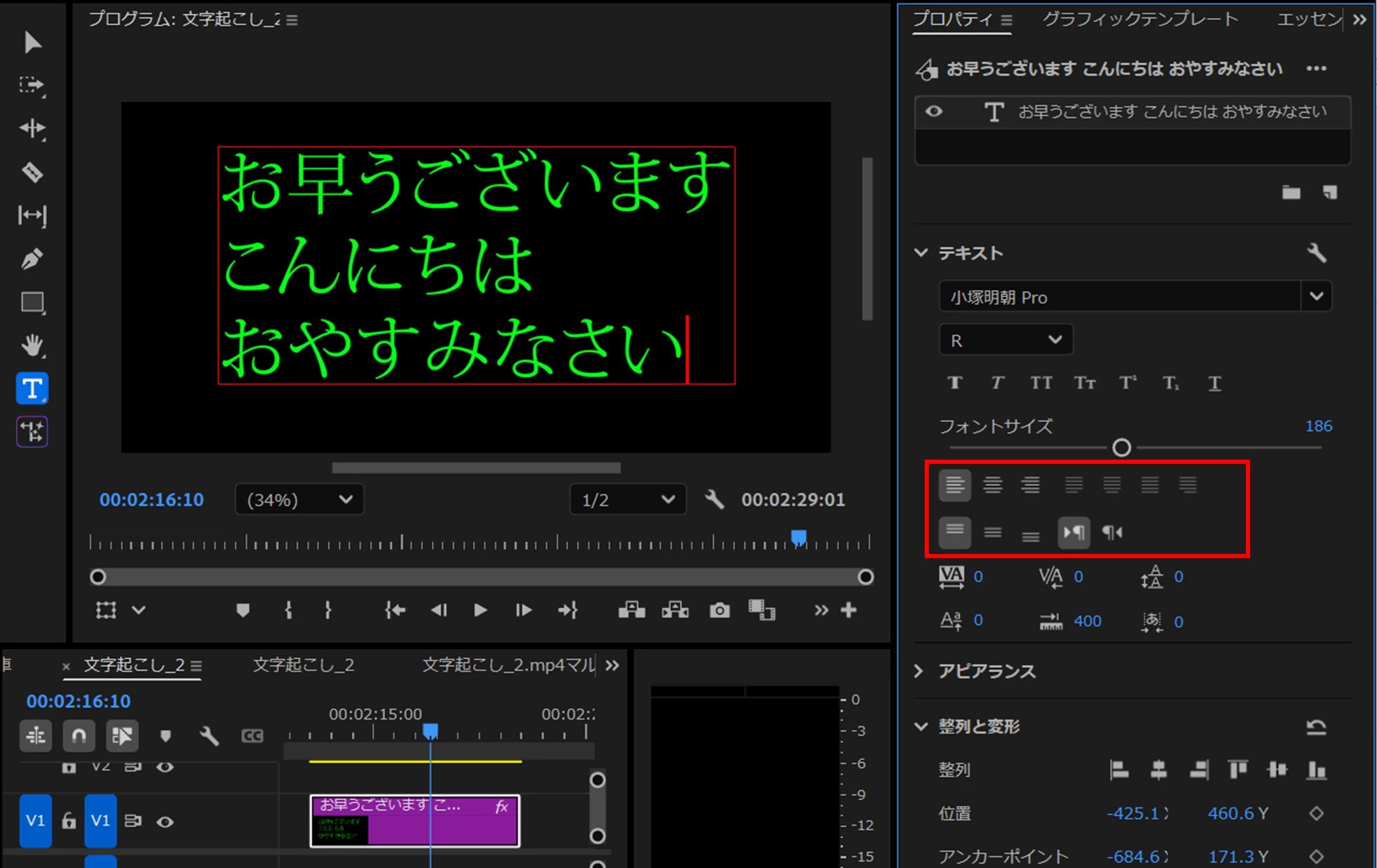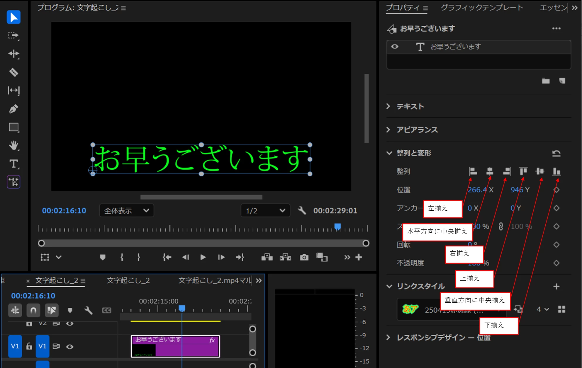 テキストで文字の書き始めを左 右 中央と変えるのはどこを操作すればよいでしょうか?