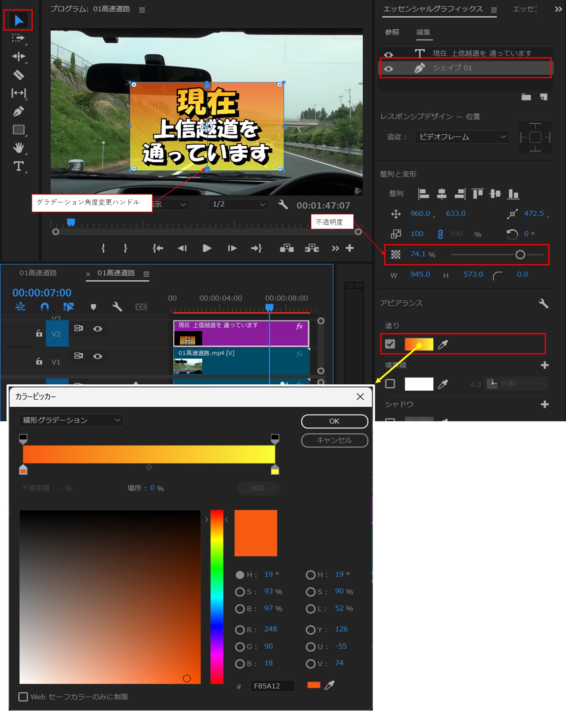 シェイプのグラデーションの角度変更は、シェイプ01レイヤーを選択し、選択ツールをクリックすると、プログラムモニターのシェイプ内へグラデーション角度変更ハンドルが表示されますので、このハンドルを移動して調整します(デフォルトでは、横方向のグラデーションになっています)。
