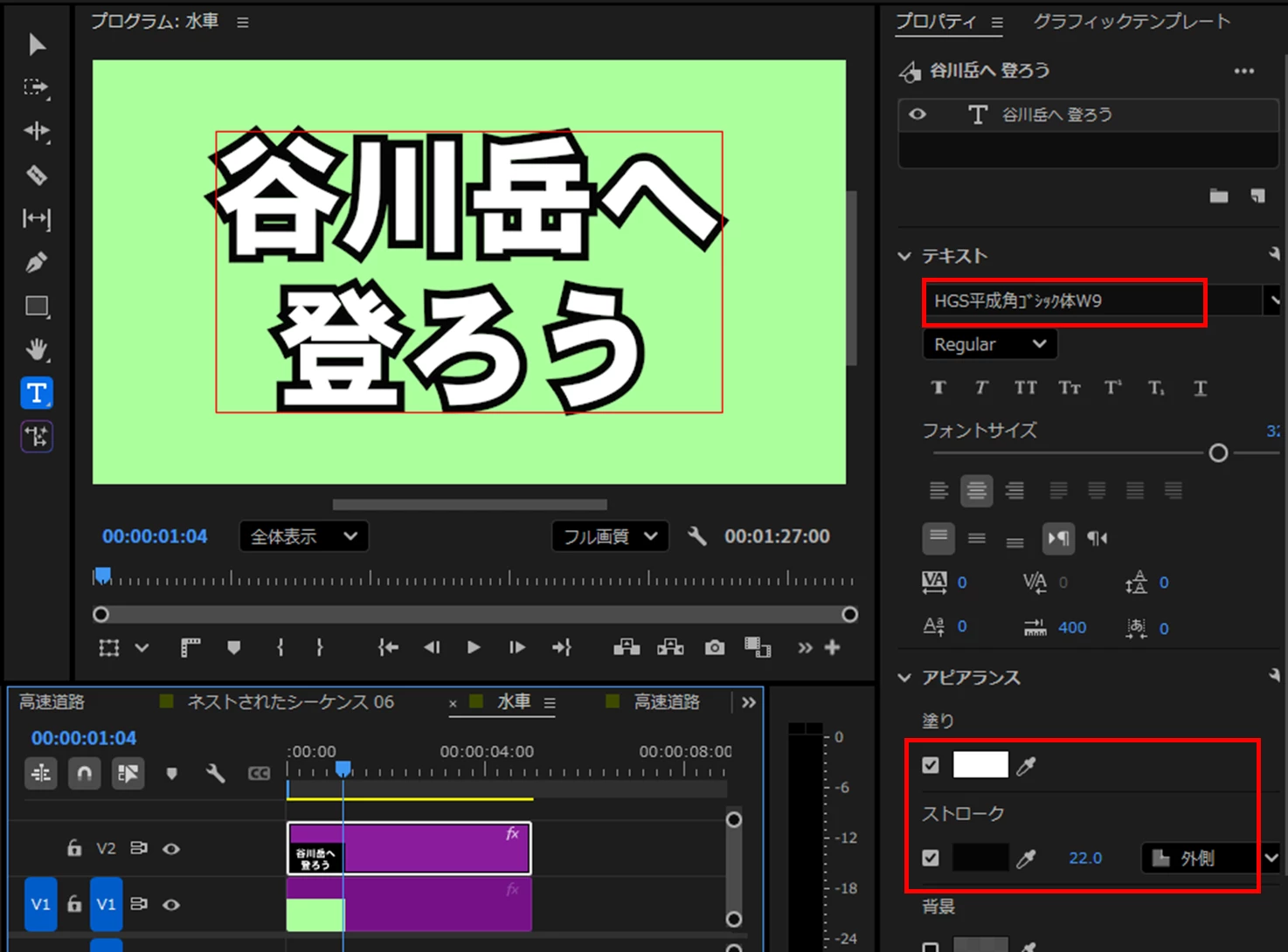 ①フォントはHGS平成角ゴシック体を選びました。塗りは任意の色にし、ストロークは幅広く付けました。