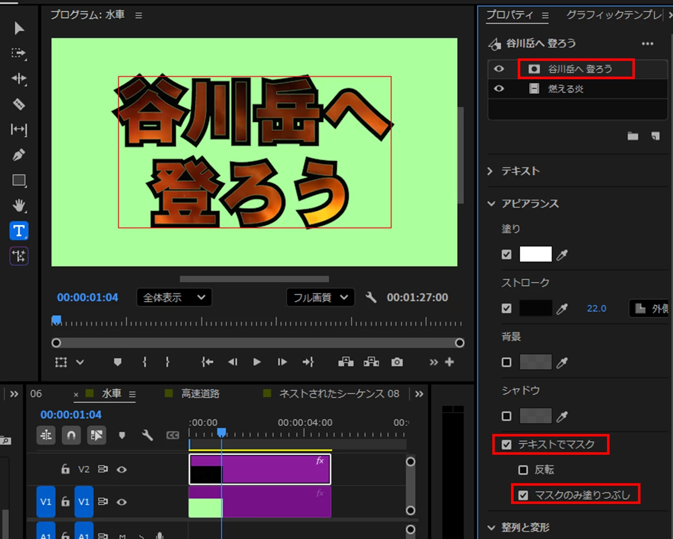 ③テキストクリップを選択し、「プロパティ」パネルで「テキスト」レイヤーを選択して、「アピアランス」項で「テキストでマスク」にチェックを入れ、さらに「マスクのみ塗りつぶし」にもチェックを入れます。